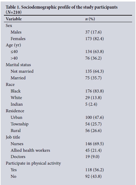 The majority of the participants were not married (64.3%), were black (83.8%) and were nurses (69.5%), and close to half (47.6%) were living in urban areas; 56.2% reported that they participated in physical activity other than that involved in their normal daily routine (Table 1).