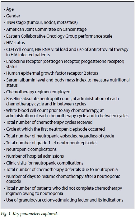 A retrospective chart review of all patients who underwent chemotherapy for breast cancer over the 4-year period 1 January 2012 - 31 December 2015 at the oncology units at Inkosi Albert Luthuli Central Hospital and Addington Hospital in Durban, KZN, was conducted. These hospitals are tertiary referral centres for the coastal belt of KZN. Key data captured from the clinical notes are shown in Fig. 1. Primary prophylaxis was defined as the use of granulocyte colony-stimulating factor (G-CSF) up front from the first cycle of chemotherapy until the end, and secondary prophylaxis as use of G-CSF in response to a neutropenic complication.