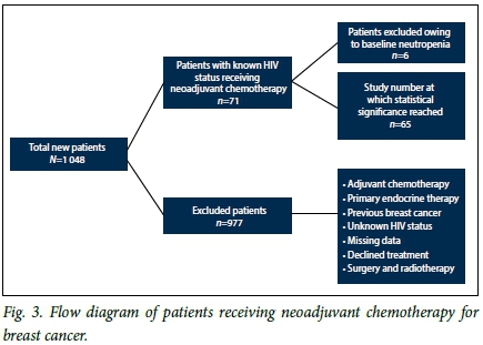 The study population consisted of previously untreated newly diagnosed patients of all ages with documented HIV status and histologically confirmed breast cancer who received neoadjuvant chemotherapy. The cohort consisted of women only, as men did not fulfil the eligibility criteria. The total number of new female patients diagnosed with breast cancer in the study period was 1 048, with the average number of new cases per year being 262. The cohort had stage II - IV breast cancer. Stage IV patients had oligometastases and received radical treatment. To minimise confounding factors, we excluded patients with baseline pre-existing neutropenia, those with a history of previous chemotherapy or a history of breast cancer or other prior or existing cancers, those with active infection, those receiving concurrent treatment with medication that predisposes to neutropenia, such as long-term steroids, quinidine and hydralazine, those who had stopped neoadjuvant chemotherapy prematurely for any reason other than neutropenia, and those for whom critical data in charts were missing (Fig. 3).