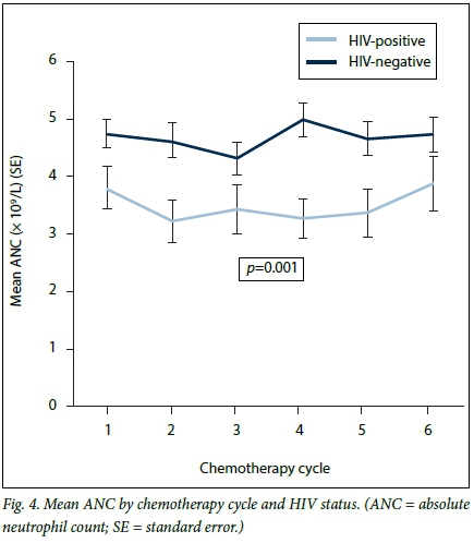 One patient with neutropenia did not complete her chemotherapy schedule, which was aborted after two cycles owing to inability to achieve normal ANC levels after the first dose of chemotherapy. She had six recorded episodes of grade 2 - 3 neutropenia over a period of 14 weeks during her chemotherapy schedule. The complication experienced was a respiratory infection, which was managed on an outpatient basis with oral antibiotics. She was 50 years old, with HIV infection and stage III breast cancer. She had a CD4 count of 477 cells/uL and a viral load of 23 296 copies/L, but was not on ART. She was commenced on tamoxifen 20 mg/d, and the tumour was deemed resectable 7 months later. None of the study patients died.