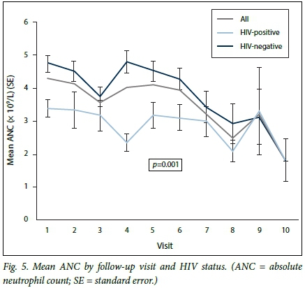 RESULTS. HIV-infected patients formed 32.3% of the group, and 95.2% of them were on antiretroviral therapy. The mean age (standard deviation (SD)) of the cohort was 48.5 (13.2) years (40.6 (9.6) years for the HIV-infected group v. 52.0 (13.1) years for the uninfected group; p<0.001). Ninety-five neutropenia episodes were observed (rate 0.85 per 1 year of follow-up time). Following multivariate adjustment, patients with HIV infection were almost two times more likely to develop CIN (hazard ratio (HR) 1.76, 95% confidence interval (CI) 1.06 -2.92; p=0.029. A high baseline absolute neutrophil count (ANC) (HR 0.80, 95% CI 0.68 - 0.95; p=0.005) remained significantly associated with protection against CIN.