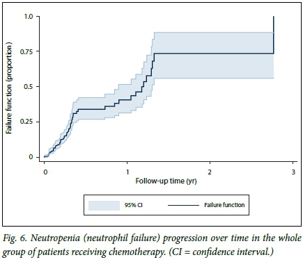 Data were analysed using Stata version 13.0 (StataCorp, USA). Continuous variables were summarised using means, standard deviations (SDs) and ranges. If data were skewed, medians and ranges were presented. Significant associations in contingency tables (cross-tabulations) were assessed using Pearson's x2 test. If an expected cell count in the cross-tabulation contained <5 observations, Fisher's exact test was used instead. Time-to-event (survival) analysis was employed to estimate the overall incidence of neutropenia and associated 95% confidence intervals (CIs). We constructed Kaplan-Meier failure curves to assess differences in failure by key covariates. 'Failure' was defined as failure of the patient to maintain a normal neutrophil level, i.e. development of neutropenia. We further extended our analysis to employ bivariate and multivariate survival modelling (Cox proportional hazards approach) to identify covariates of incident neutropenia. An adjusted p-value of <0.05 was considered statistically significant. Only factors that were statistically significant on the unadjusted logistic regression analysis were entered into the adjusted logistic regression model.