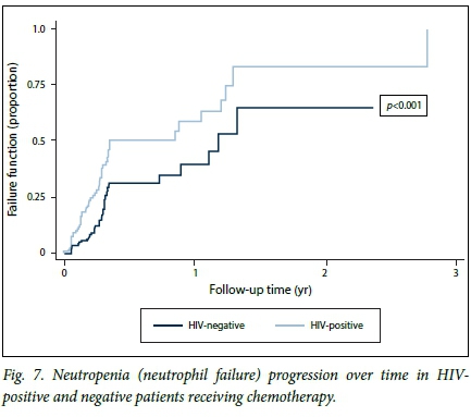Neutropenia can result in poor tolerance to chemotherapy, leading to dose reductions, delays in chemotherapy administration, morbidity and mortality, and can ultimately influence treatment outcomes.[13,18] Active identification of predisposing risk factors prior to commencing chemotherapy is essential. In this study, HIV infection was shown to be an independent predictor of CIN. Decreased immunity due to active infection, myelosuppressive drugs and comorbidities have been reported as risk factors for developing CIN,[18-22] but HIV infection as an independent predictor of CIN in patients with solid tumours has not been reported. Neutropenia is a significant independent risk factor for bacteraemia in HIV-positive patients. It has been reported to occur in 35 - 75% of patients with AIDS.[23] CIN also occurred at a much faster rate in patients with HIV infection in our cohort. We postulate that this is because HIV-negative patients have an immune advantage over infected patients. HIV infection causes neutrophil dysfunction in a number of ways, including impaired chemotaxis and phagocytosis, an accelerated number of apoptotic neutrophils, expression of cellular adhesion molecules at the surface of the neutrophils, and production of toxic oxygen species.[23] Neutropenia and neutrophil dysfunction associated with HIV infection are partly mediated by abnormal regulation of cytokines.[23] In response to neutropenia, cytokines are released to increase the production of neutrophils. In the presence of HIV infection this is impaired somewhat, resulting in the neutropenic patient recovering much more slowly, with increased episodes and a more severe degree of neutropenia than in an HIV-uninfected neutropenic patient. HIV-infected patients may have other compounding morbidities such as opportunistic infections and manifestations of AIDS, and some may already have a baseline neutropenia due to their HIV infection before they start chemotherapy.[23] Furthermore, malignancy in itself can cause myelosuppression.[23,24] These factors are thought to contribute to HIV-infected patients' higher risk of developing neutropenia.