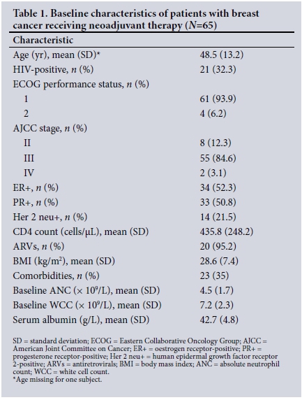 METHODS. A retrospective chart review and analysis was conducted in the oncology departments at Inkosi Albert Luthuli Central Hospital and Addington Hospital, Durban, South Africa. The study population consisted of 65 previously untreated women of all ages with stage II - IV breast cancer and known HIV status treated with neoadjuvant chemotherapy from January 2012 to December 2015.
