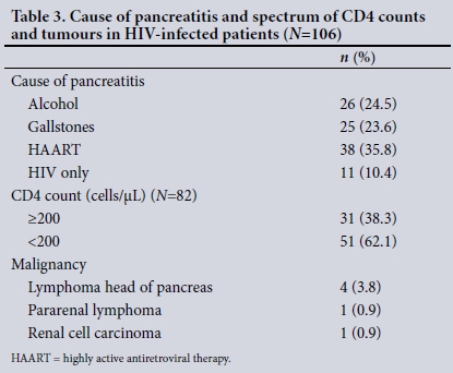 RESULTS. One hundred and six (16.9%) of 627 patients admitted with acute pancreatitis during the study period were infected with HIV. Most were female (65.1%) and black African (91.5%). The serum amylase level was used to confirm acute pancreatitis in 50 patients, with a mean of 1 569 IU/L (range 375 - 5 769), and urinary amylase in 56 patients, with a mean of 4 083 IU/L (range 934 - 36 856). Alcohol was a less frequent cause of pancreatitis in the HIV-positive group than in patients who were HIV-negative (24.5% v. 68.3%), and the prevalence of gallstones as a cause was similar (23.6% v. 17.9%). Antiretroviral therapy was associated with pancreatitis in 35.8%, and 6 (5.7%) had abdominal malignancies. Sixteen (15.1%) had pancreatic necrosis, 20 (18.9%) had septic complications, and 6 (5.7%) died.