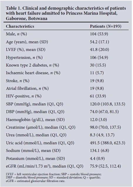 The study included 193 patients, mostly (98.4%) black Africans (Table 1). The patients' ages ranged between 20 and 89 years, with a mean (SD) of 54.2 (17.1) years. All patients were symptomatic and the majority (77.5%) presented in NYHA III or IV functional classes. Overall, the median (IQR) systolic and diastolic blood pressures were 120 (104 - 133) mmHg and 74 (67 - 82) mmHg, respectively. More than half (54.9%) of patients were hypertensive. A prior diagnosis of diabetes mellitus was present in 30 (15.5%) and often coexisted with hypertension. The mean LVEF was 41.7%, and about two-thirds (64.8%) of patients had HF with systolic dysfunction (LVEF <45%).