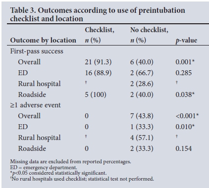 RESULTS: Forty-one cases were recorded in patients aged 1 - 60 years. No instances of unsuccessful airway management were reported. Recorded first-pass intubation success rates were higher in receiving EDs than rural hospitals (19/22 v. 2/7; p=0.003). Use of a formal preintubation checklist was associated with a higher first-pass success rate (21/23 v. 6/15; p=0.001) and fewer adverse events (0/23 v. 7/16; p<0.001). Identified adverse event rates were 1/22 (EDs), 5/8 (rural hospitals) and 2/9 (roadside). Unmedicated intubation was more common in rural hospitals than EDs (3/8 v. 1/22; p=0.019), despite absence of cardiac arrest in these cases. Minimum standards of anaesthetic monitoring were not consistently met in any setting