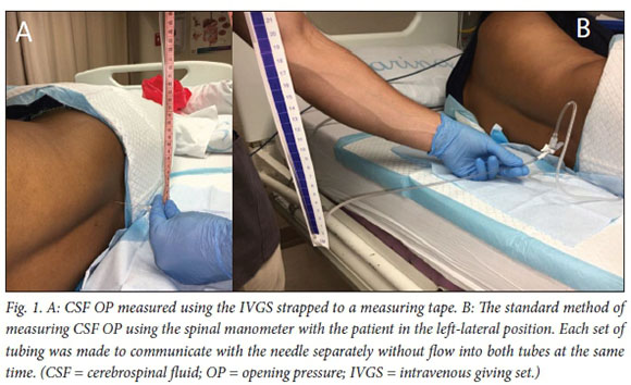 The standard method of measuring CSF OP is with a spinal manometer, but in many resource-limited centres manometers are not readily available. The cost of an intravenous giving set (IVGS) is ZAR1.77 and that of a disposable spinal manometer is ZAR70.00 (Adcock Ingram, January 2018). The substantial price difference and the difficulty in procuring spinal manometers, which are considered non-stock items, result in unavailability of spinal manometers in peripheral hospitals.