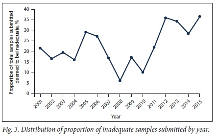Fig. 2 shows the distribution of total samples submitted according to year. The largest number of samples submitted was in 2001 (n=157) and the smallest in 2006 (n=33). The greatest proportion of inadequate samples was submitted in 2015 (36.7%), with a trend upwards in the last 5 years (Fig. 3). The majority of specimens submitted had no HIV status specified for the patient; 364 (35.9% of specimens) had HIV status specified, and of these patients 162 (44.5%) were HIV-negative and 202 (55.5%) were HIV-positive.