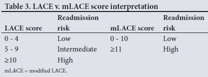 The LACE score incorporates four parameters: length of stay of the index admission (L), acuity of the admission (A), comorbidities, incorporating the Charlston comorbidity index (C), and number of emergency department visits in the past 6 months (E) (Table 1).[4,18] A LACE score of >10 provides a good threshold to differentiate between patients with low/medium and high risk of readmission, while an mLACE a score of >11 identifies the high-risk patient (Table 3). High-risk patients are 2.6 times more likely to be readmitted than those at low risk.[5,6,18]