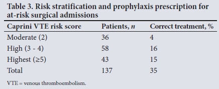 RESULTS: A total of 179 patients were included in the study, of whom 56% were male and 44% female. The average age was 45 (range 18 -83) years. Of the total number of participants, 33% were elective cases and 67% were emergency admissions. With application of RAM, 77% of patients were at risk of VTE (Caprini score >2), with 81% of elective and 74% of emergency patients being at risk. The most prevalent risk factors for VTE were major surgery (34%), age 41 - 60 years (30%), age 61 - 74 years (20%) and sepsis during the previous month (27%). A contraindication to chemoprophylaxis was recorded in 30% of patients, with the most prevalent being renal dysfunction (40%), peptic ulcer disease (34%), active bleeding (17%), liver dysfunction (17%), coagulopathy (6%) and recent cerebral haemorrhage (6%). With regard to VTE risk profile and contraindications to chemoprophylaxis, the correct thromboprophylactic treatment was prescribed to 26% of at-risk patients, with 21% of elective and 27% of emergency admission patients receiving the correct therapy
