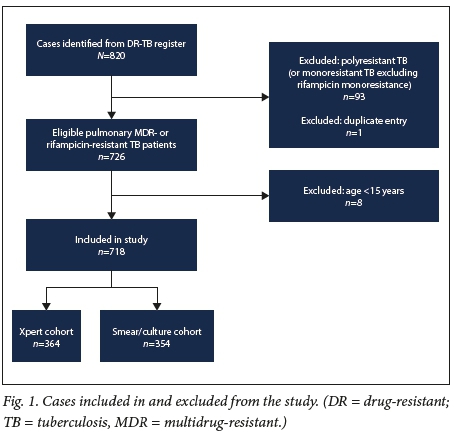 Of a total of 820 MDR-TB cases screened, 718 met the study inclusion criteria (Fig. 1). One hundred and two patients were excluded: 1 was a duplicate entry, 93 had polyresistant TB (not including both isoniazid and rifampicin) and monoresistant TB (excluding rifampicin monoresistance), and 8 were aged < 15 years. We enrolled 354 patients into the smear/culture cohort and 364 into the Xpert cohort.