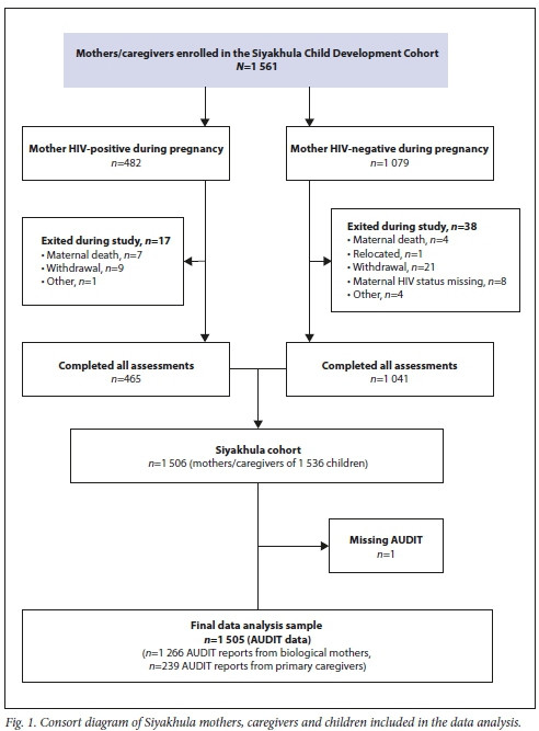 A total of 1 506 participating mothers and caregivers completed the assessments. One mother had missing AUDIT data and was removed from analysis, leaving a final sample of 1 505: 1 266 mothers and 239 primary caregivers (Fig. 1). The majority of the mothers/ caregivers were aged 31 - 40 years (39.0%), and most of the children (84.8%) were aged >9 years (Table 1). Mothers/caregivers were categorised as not drinking (n=1 279, 85.0%), drinking but below the HD threshold (n=181, 12.0%), and HD (>8 AUDIT) (n=45, 3.0%).