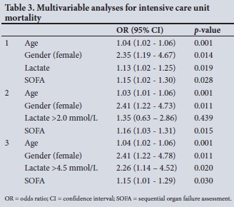This study has several potential limitations. The retrospective design could have led to bias. The data were derived from a single ICU, and may not be generalisable. The study ICU is a busy referral centre, however, and is likely to be representative of the realities of critical care in at least the state sector in SA. It is the only study of its kind from Africa and is therefore the most representative study available for the continent. The primary outcome was ICU mortality as opposed to hospital mortality, which is the most common outcome used in similar studies. The choice of ICU mortality was due to practical difficulties in establishing hospital mortality in the study population, and while this does not invalidate the findings of this study, it does potentially confound direct comparison with other studies that used hospital mortality as their primary endpoint. The use of adrenaline as the predominant inotrope/vasopressor may have led to an increase in serum lactate levels. Noradrenaline is not freely available in SA, further illustrating the need for studies that reflect practice in different settings.