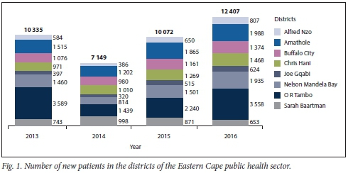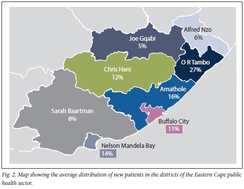 Fig. 2 depicts the 4-year distribution of new patients throughout the EC. The largest proportion (27%) is seen in the coastal district of O R Tambo and the smallest proportion (4.62%) in the district of Joe Gqabi.