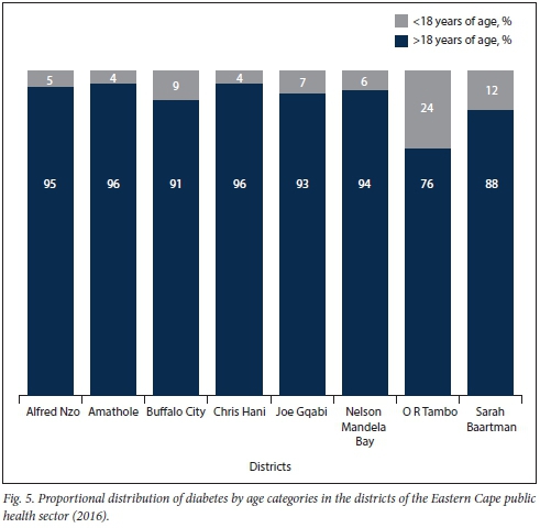 Type 2 diabetes is typically seen in patients >30 years of age, while type 1 diabetes presents in early adolescence. More exceptions to this unofficial rule have been noted in the recent literature. However, >90% of diabetic patients remain categorised as type 2.[18]Fig. 5 displays the proportional distribution of diabetic cases categorised by patient age (<18 and >18 years). The districts of O R Tambo and Sarah Baartman have a larger than usual population of diabetic patients <18 years of age. Considering their young age, it is highly likely that these patients were diagnosed as type 1 diabetics.