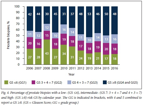 Biopsies with a PCa finding were analysed by GS and GG risk group for the four racial groups, reported as a stacked bar chart.[9,10] We used a stacked bar chart to report the percentage of biopsies per year for the GS and GG risk categories, with GG4 and GG5 reported together.