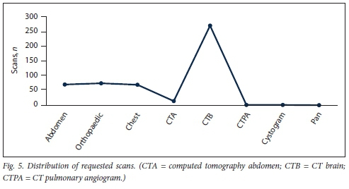 Just fewer than half of the scans (n=246; 47.4%) were performed on patients residing in the George area, with the rest being from surrounding hospitals. Scans were mostly performed on inpatients n=393; 76%), with the emergency medicine department requesting the most scans (n=166; 32%), followed by internal medicine (n=74; 14%) and psychiatry, with the lowest number of requests (n=4; 0.8%). Only 40 (7.7%) scans were direct referrals from surrounding district hospitals to the radiology department, without initial acceptance by emergency medicine or the appropriate specialty. After scanning was done, the patients were transferred to their respective hospitals for further management.