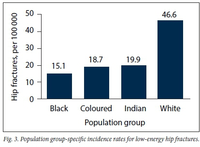 Historically FHFs were believed to be uncommon in black African populations, with some evidence attributing this to differences in bone mineral density and hip geometry.[7-11] Until recently, the only literature available on hip fractures in South Africa (SA) was published by Solomon[9! in 1968, focusing on a small subpopulation of black South Africans in Johannesburg, which reported low incidence rates of 4.2 and 4.6 per 100 000 for males and females, respectively. This reported incidence is surprisingly low when compared with Scandinavian countries such as Denmark, with 290 and 574 per