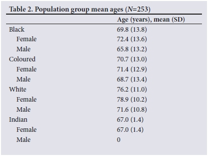 During the 1-year study period, a total of 305 patients with new hip fractures were admitted to Livingstone Hospital for further management. Information on mechanism of injury was not recorded in 12 cases (3.9%), and these cases were therefore excluded from analysis. Of the remaining 293 fractures, 253 (86.3%) were low-energy hip fractures and 40 (13.7%) were high-energy fractures. A total of 253 patients were therefore included in the study. The mean (standard deviation) age of patients with an FHF was 72.6 (13.1) years (95% confidence interval 69.9 - 73.2). The majority of participants were female (64.8%; n=164) (Table 1), with most participants having suffered intertrochanteric fracture (48.6%; n=123). The mean ages for the different population groups are presented in Table 2.