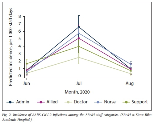 Frequencies and proportions were used to describe categorical variables. Continuous variables were described using means and standard deviations (SDs). The x2test was used to determine crude associations between categorical variables, including severity of SARS-CoV-2 infections. In order to estimate incidence, data were aggregated at level of staff category (administrative, allied healthcare professionals, medical doctors, nurses, support) by month of observation (June, July August). The number of staff in each of the categories was assumed to be the same for each month. Staff days per month (exposure) for each staff category was calculated as the number of staff in the category x the number of days in the month (30 for June, 31 for July and August) X 5 days (assumed number of days per week). For doctors, the assumed number of days per week was 6. Poisson regression analysis was used to model the number of SARS-CoV-2 cases for a staff category in a month, with staff days/1 000 as exposure. Crude unadjusted incidence is reported as the predicted number of cases per 1 000 staff days with associated 95% confidence intervals (CIs). To estimate incidence for months over hospitals, and vice versa, models were fitted with an intercept and main effect for month and hospital, respectively. A model with main effects for month and hospital, as well as an interaction term, was used to estimate incidence at each month-hospital combination. A similar approach was used to estimate incidence for staff groups across months for SBAH. Model-based inference was done in order to compare the incidence between SBAH and the other hospitals. The incidence for doctors was compared with the average incidence for the other four staff categories, also using the model estimates. Observed case and death data for SA and GP were retrieved for June - August 2020 from the Coronavirus COVID-19 (2019-nCoV) Data Repository for South Africa. Mid-year population estimates for 2020 for SA and GP were retrieved from the relevant report by Statistics South Africa.[10] All analysis was conducted using Stata 16 (StataCorp, USA). Statistical significance was set at 5%.