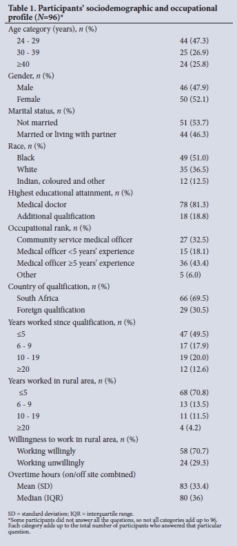Of the 213 doctors who were invited to participate, 96 signed informed consent and completed the sociodemographic and occupational profile questionnaire. Of these, 89 completed the MBI, 87 the PHQ-9 and 86 the GAD-7. Of the sample, 47.3% (n=44) were aged 24 - 29 years, 52.1% (n=50) were female, 70.8% (n=68) had worked in a rural setting for <5 years, and 30.5% (n=29) had attained their medical qualifications outside SA.