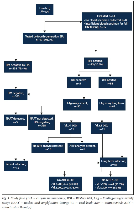 Between 1 January and 31 December 2019, a total of 494 symptomatic STI service attendees were enrolled at the two sentinel sites, located in Gauteng and Western Cape provinces, respectively. Of the 494 enrolled, 451 (91.3%) had adequate plasma specimens for HIV biomarker measurement (Fig. 1). The median (interquartile range (IQR)) age of those tested was 29 (25 - 35) years, with 101 (22.4%) aged <24 years, 313 (69.4%) male, and 109 (24.2%) enrolled at the Western Cape site.