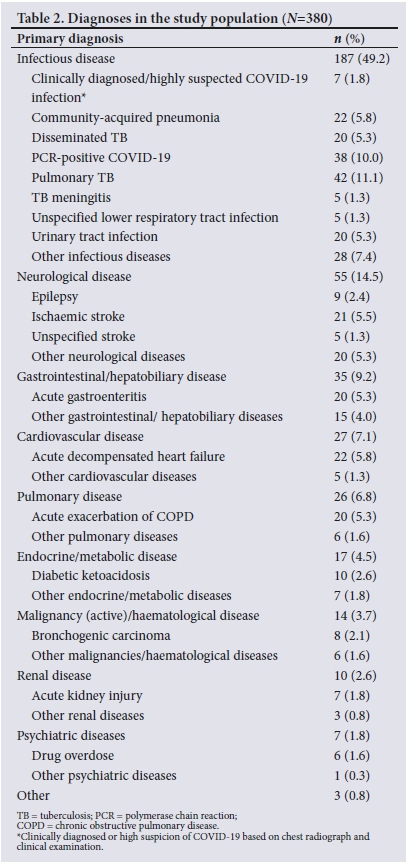 The most frequently documented diagnosis was infectious disease (49.2%). This was followed by neurological disease, which accounted for 14.5% of the total sample. Various forms of TB as well as polymerase chain reaction (PCR)-positive and clinically diagnosed/ highly suspected COVID-19 infections accounted for 17.7% and 11.8% of the sample, respectively. Table 2 provides an overview of the diagnoses identified among sampled patients.