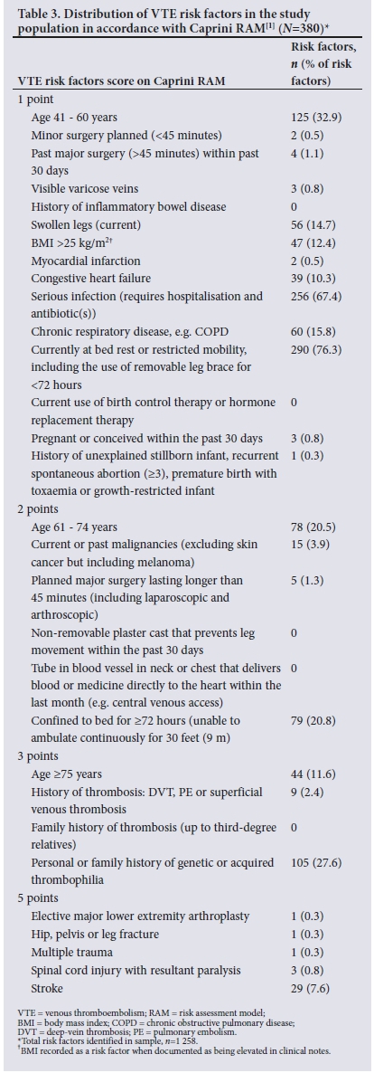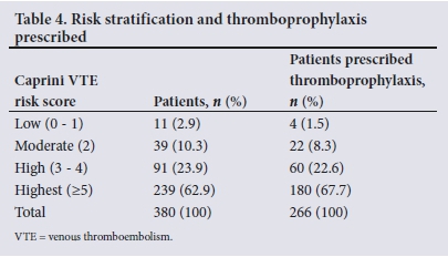METHODS. A retrospective, cross-sectional study design was employed in the medical wards of two district hospitals and one regional hospital in the Cape Town metropole, Western Cape. Medical folders of adult medical inpatients admitted between January and July 2020 were reviewed to assess VTE risk using the Caprini RAM. Thromboprophylaxis therapy prescribed and contraindications to chemoprophylaxis were also evaluated.