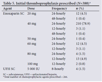 Our finding that enoxaparin 40 mg 24-hourly was prescribed in 89% of our sample was anticipated, as this is the standard thromboprophylaxis regimen in most public healthcare sector hospitals in the Western Cape[29,30] Dosing anomalies (doses >40 mg and frequencies differing from 24-hourly) were detected in 15% of patients who were prescribed thromboprophylaxis. Du Plessis et α1.[12]reported similar findings, with 17.5% of their sample noted to have received the incorrect dose of an LMWH. These findings may be indicative of a new trend in VTE prophylaxis prescribing, where rates of thromboprophylaxis prescribing in medical inpatients are increasing, but inappropriate dosing is increasing as a consequence. This trend may be further complicated by the inappropriate prescribing of chemoprophylaxis in patients with contraindications, as evidenced by the 4.5% of patients in our sample who received chemoprophylaxis throughout admission. Comparable findings were reported by Rocher et al.[2]who found that 5.6% of patients in their sample were prescribed some form of chemoprophylaxis despite clear contraindications.