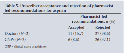 Although the majority of MTPs were identified as BMI not documented. the MTP type no medical indication noted (n=87) was the second most common MTP that attracted attention during the pharmacist intervention study. The prescribed medicine that emerged as a particular concern for the research pharmacist during the study was aspirin. Of the 87 pharmacist-led interventions for the MTP no medical indication noted, 70 (15.4%) were directly related to irrational prescribing of aspirin (Table 5). Prescriber rejection of pharmacist-led recommendations for aspirin led to over three-fold expenditure estimates for 28-day (ZAR196.37) and 6-month (ZAR1 178.22) supplies, when compared with prescriber acceptance of the pharmacist's recommendation (ZAR53.80 and ZAR322.80, respectively) (Western Cape Master Procurement Catalogue, November 2016).