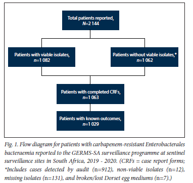 This was a cross-sectional study of patients with CRE bacteraemia reported to the Group for Enteric, Respiratory and Meningeal Diseases Surveillance in South Africa (GERMS-SA) from January 2019 to December 2020. Surveillance methods for the programme are detailed elsewhere.[13] Briefly, the study sites were 16 public sector tertiary academic hospitals across four provinces of SA (Gauteng (n=4), KwaZulu-Natal (n=7), Western Cape (n=3), and Free State (n=2)). All patients with CRE bloodstream infections were included in the surveillance programme, and isolates, when available, were sent to the reference laboratory at the National Institute for Communicable Diseases (NICD) for confirmatory testing. Systematic and independent examinations (i.e. audits) of the diagnostic laboratories' records were done to ensure that all cases of CRE bloodstream infection were reported. Surveillance officers collected demographic and clinical information on patients through medical record reviews and patient/caretaker interviews using standard case report forms (CRFs). As patients were not followed up, the in-hospital outcome was documented at the time of CRE completion.