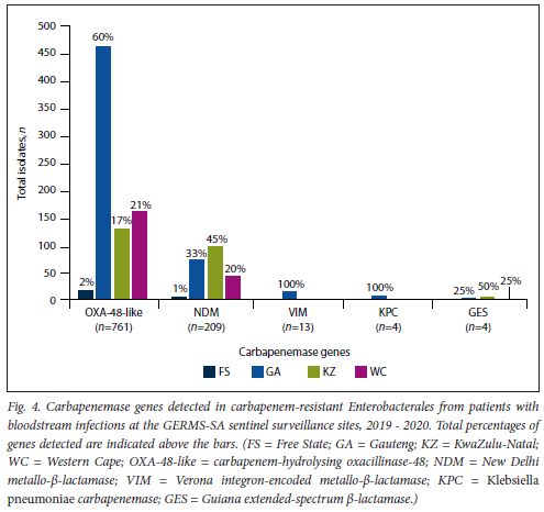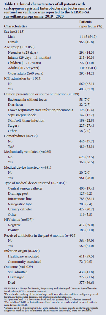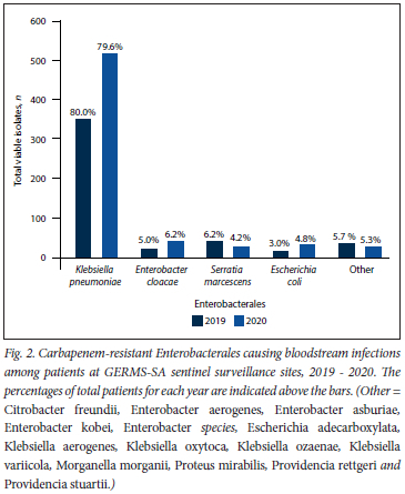 OBJECTIVES: To present an update on the epidemiology of CRE bloodstream infections among hospitalised patients reported under the Group for Enteric, Respiratory and Meningeal Diseases Surveillance in South Africa (GERMS-SA) between January 2019 and December 2020