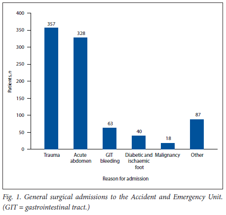 We conducted a retrospective descriptive audit of patients admitted to the adult general surgery department at Pietersburg Hospital over the 8-month period April - November 2021. The patient data were captured by the admitting doctor using a data collection tool. All adult patients reported to have been admitted the previous day were included in the study. We excluded all patients managed in and discharged from the AEU, and patients who died in the AEU. The senior consultant recorded the information using the same data collection tool during the daily weekday morning meeting. The data recorded included gender, age, presenting symptoms, provisional diagnosis, surgical intervention, and affected body site. In addition, if the surgical intervention required had not yet been performed, reasons for not performing the operation were recorded. The clinical diagnoses were further classified into trauma and non-trauma (medical emergency) cases. Trauma cases were subdivided according to the nature of the injury suffered. The collected data were captured using Microsoft Excel 2010 (Microsoft Corp., USA). The data were analysed using Stata software, version 16 (StataCorp., USA). Patient ages were grouped into categories. Categorical variables are expressed as proportions, and continuous variables as means and standard deviations.