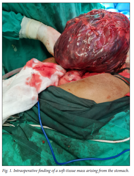 Although GIST is one of the most common mesenchymal tumours of the stomach, its clinical symptoms are nonspecific and depend on tumour size and location. Small GISTs are usually asymptomatic and only detected during investigations or surgical procedures for unrelated medical conditions.[1,7] Our patient's GIST was >16 cm in size and weighed >3 kg. It is very unusual for a tumour of this size to be asymptomatic, but our patient only became symptomatic after he sustained BAT.