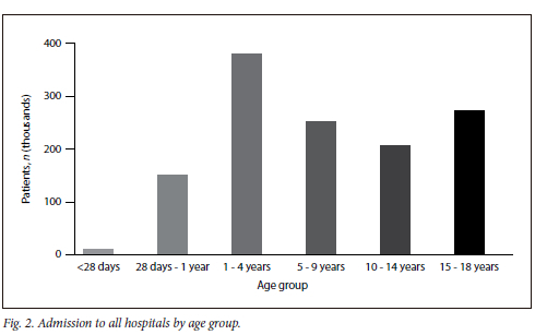 The under-5 age group represents 58% of admissions to hospital (Fig. 2). There was a small increase in hospitalisations in later teenage years, as obstetric and traumatic conditions became more prevalent. [28]