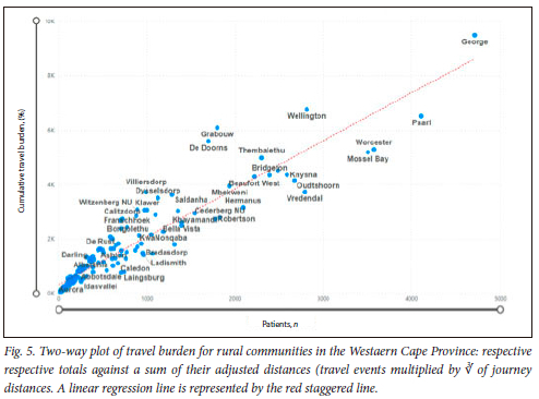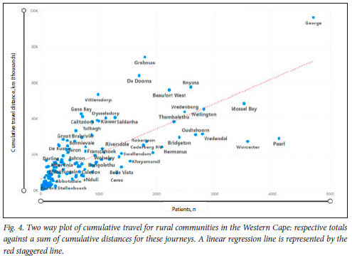 Data were analysed to demonstrate communities with travel distances that were outliers relative to average or median (interquartile range (IQR)) travel distance. 'Patient kilometres' (total patients multiplied by distances to hospital) were calculated for each community. We postulate that in rural areas, where travel over very large distances are routine, a few extra kilometres of travel do not impart the same real-world experience of travel burden that the same distance would impart in an urban area. To offset this effect, and to minimise the impact of very long journeys on the 'patient-kilometres' product in rural areas, a travel distance correction was made by using the cube root of distances to hospital. This correction was not applied within the urban CoCT, which had shorter and more uniform distribution of travel distances. Regression modelling was calculated using a least squares method.