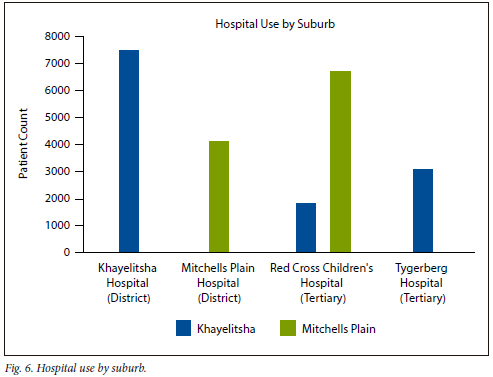Two quite distinct hospital utilisation patterns are observed in two similarly sized urban suburbs in the CoCT, in this case Mitchells Plain and Khayelitsha, each with their own local level 1 hospital (Fig. 6). For children living in Khayelitsha, 7 481 of 12 340 hospital admissions (61%) occurred at the local district hospital, whereas for children living in Mitchells Plain, only 38% of admissions occurred at the local hospital, with a comparatively higher utilisation of the more distant tertiary facility.