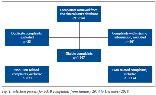 This research determines the types of clinical complaints reviewed by the CMS's clinical unit and medical conditions related to complaints between 2014 and 2018 to identify trends in PMB-related complaints. The objectives were to determine and describe the pattern of PMB complaints received by the CMS from 1 January 2014 to 31 December 2018, and to identify medical conditions related to the clinical complaints reviewed by the CMS.