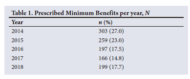 4. Mngadi P, Wolvaardt J, Thsehla E. Agreeing on the minimum: An 11-year review of Prescribed Minimum Benefits appeals. S Afr Med J 2019;109(7):498-502. https://doi.org/10.7196/SAMJ.2019.v109i7.13683 [ Links ]