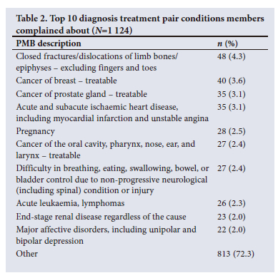 RESULTS. A total of 2 141 complaints were retrieved and 1 124 PMB complaints were included in the study. The median of PMB complaints per year was 225. Most of the complaints (43.6%, n=490/1 124) were lodged by members themselves. Non-communicable diseases constituted most of the PMB conditions that members complained about. Medicine and surgery were the services that were mostly denied full payment by medical schemes. Open medical schemes accounted for many (73.8%, n=830/1 124) of the complaints.