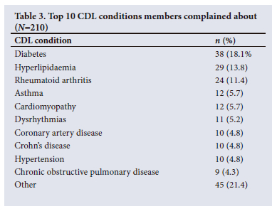 CONCLUSION. Chronic conditions are the main diseases that medical scheme members complain about. Member education and clear definitions of PMBs should be prioritised by medical schemes and the CMS.