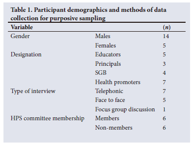 In GT, it is anticipated that when the researcher analyses the initial data, 'it will raise questions, suggest relationships, highlight gaps in existing data and reveal what the researcher does not yet know'.[15] The researcher then takes the new information and uses it to meticulously select participants and adjust questions in the next round of data collection to fill the existing gaps, clarify any uncertainty and develop an emerging theory - a procedure known as theoretical sampling in GT.[15,16] To facilitate this process, during data collection, the participants were made aware that the researcher may contact them again in the event that clarification was needed. The sampling process started with purposive sampling of 37 participants. These included health promoters (n=7); principals (n=10), LS educators (n=10) and SGB members (n=10). Some refused to be part of the study; at the start of data collection, only 19 of the recruited school participants had consented. The list consisted of health promoters (n=7), educators (n=5), principals (n=3) and SGB members (n=4) (Table 1).