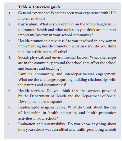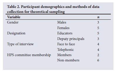 During the FGD analysis, theoretical sampling and saturation were applied when concepts that required further exploration emerged. Relevant participants were contacted, and online discussions were conducted to further explore the concepts until saturation was reached. The participants could not be called for another FGD because of COVID-19 regulations but were contacted telephonically. Regarding the interviews, with the initial data collection, it became apparent that some educators, who were not teaching LS and had therefore not been included initially, had more knowledge about the HPS programme. They were subsequently invited to participate. Contrary to the ISHP, not all LS educators were involved in HPS and other health-promotion activities; they taught LS as a curriculum subject, not as part of health promotion. Similarly, some school principals suggested their deputies in management positions should represent the school, as they had more knowledge about the HPS programme. The interview guide was adapted twice during the data collection process to accommodate the new emerging gaps and themes. After theoretical sampling, 8 participants were selected, consented, and were interviewed for the study (Table 2).