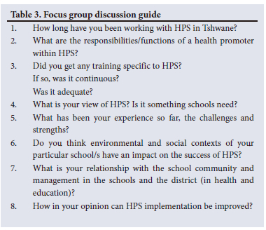All seven health promoters were female, aged between 41 and 62 years, and were not members of the HPS committee at schools, although they were occasionally invited as advisors on health matters by schools. The focus group discussion (FGD) was held at the Tshwane subdistrict 3 health offices with 7 participants, who all had experience and expertise in HPS.