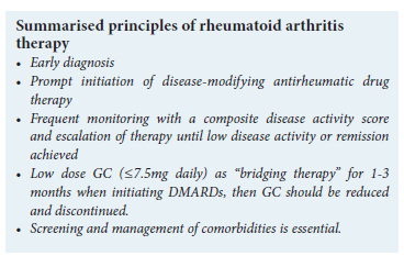 Short-term low-dose (<10 mg/day) GC 'bridging therapy' may be prescribed when initiating DMARD therapy for up to 3 months, after which the symptomatic effects seem to wane. Once DMARDs are fully effective, the GC should be tapered and stopped.[37,41]