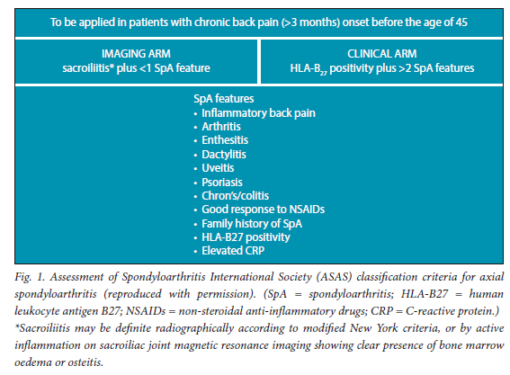 Axial spondyloarthritis (axSpA) is a chronic inflammatory joint disease affecting the axial skeleton, and falls within the 'family' of spondyloarthritides. Within this family, conditions including psoriatic arthritis, reactive arthritis and inflammatory bowel disease (IBD)-associated arthritis, as well as the prototype of axial disease (also referred to as ankylosing spondylitis), are found.[1] The prevalence of axSpA usually parallels that of HLA-B27 positivity.[2-4] Prevalence and incidence data from Africa are sparse.[3,5]