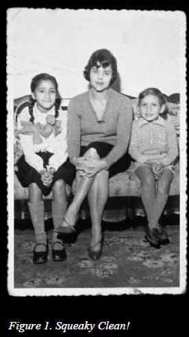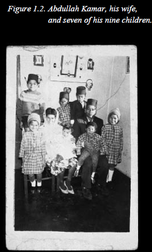 In Figure.1 and Figure1.2, the positioning of the mother is central in achieving the 'Squeaky clean' image because she represents that universal notion of motherhood; the love of a mother for her children and the evidence and guarantee of that love, in the appearance and care of her children. In Figure 1, the mother is centrally positioned in order to achieve this image of well-cared for children. In Figure 1.2, the mother figure is standing in the left-hand side of the photograph and is positioned above that of the father (who is seated somewhat off centre) and the younger children. This is a photograph of Abdullah Kamaar, his wife, and seven of his nine children. The image and narration collude in the notion that caring for one's family is a labour of love.