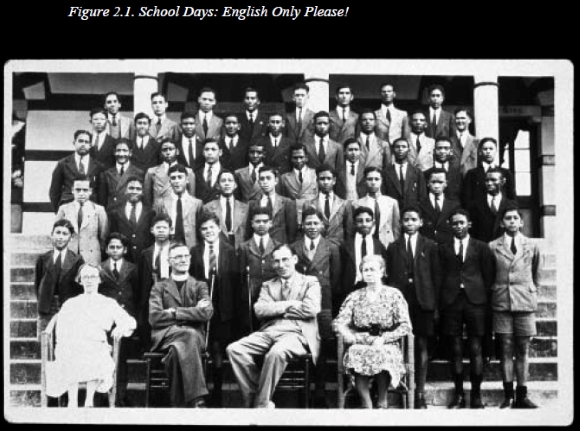 Hence, if having a well staged play - with children in lively costume, colourful props and competent staff who put it all together and a proud audience of parents and relatives - defines one as 'coloured', then how could one not want to be coloured? The broader anti-apartheid movement may object to separate government sanctioned cultural institutions, but for the principle and community of Silverlea Primary School, this play is an affirmation of the cultural and educational potential of the coloured community in the face of arduous circumstances. The family-format school photograph in Figure 2.1 is of Cyril Smith's senior class. The narrative explains that Cyril's parents decided to send him to an English-medium school in Cape Town, as opposed to a school in Johannesburg where coloured pupils were taught in Afrikaans. The text also informs us that, Cyril left South Africa in 1950, "when the Communist Party was banned" and later "died in England, where he lived happily among English-speakers for two decades or so".32 Cyril Smith's school photograph tells a story which goes deep into the political realities of living in apartheid South Africa as an English-speaking coloured person. Thus it is also a story that is intimately connected to language and coloured identity. That Cyril defines himself as a first language English-speaker and not as an Afrikaans-speaking coloured person in South Africa is instructive of the complexity of coloured identity.