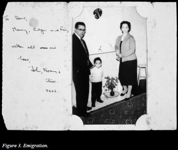 In Figure 3, a photograph is inserted into a greeting card sent to the Maurice family by John and Norma Warries. The narration informs us that the couple emigrated from Cape Town to London during the 1950s because Norma's family was unhappy with her decision to marry John on the basis of his race. The text does not explicitly state that John is coloured but leaves one to assume that Norma is white. The text also omits any reference to the question of the government's racialised sexual politics in relation to Cape Town's black and white population at the time, yet this context is implicit in the narrative and the image.